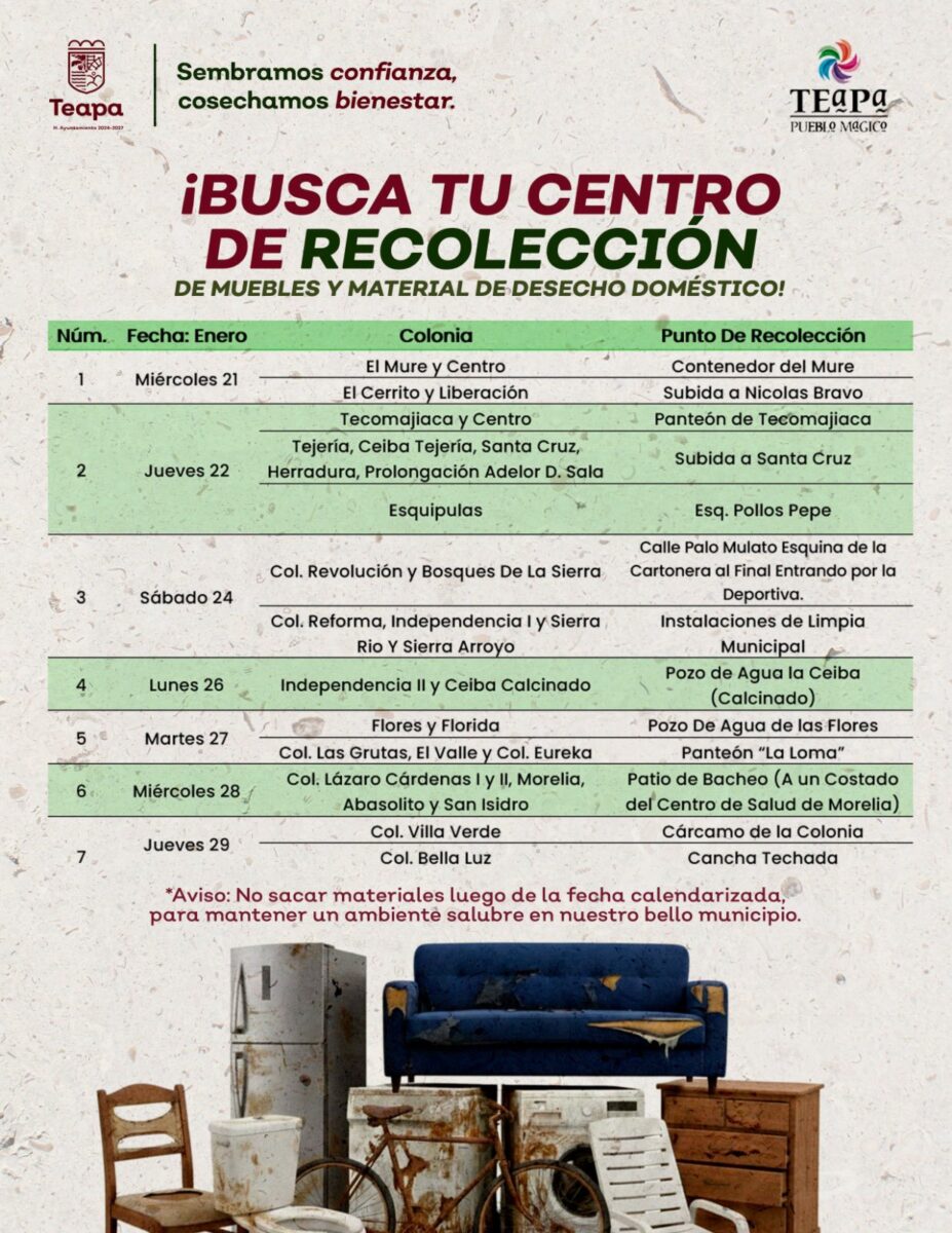 Tendremos puntos de recolección específicos en diversas colonias de la cabecera municipal. Consulta aquí nuestro calendario para conocer las fechas y horarios en los que podrás llevar tus artículos a desechar.