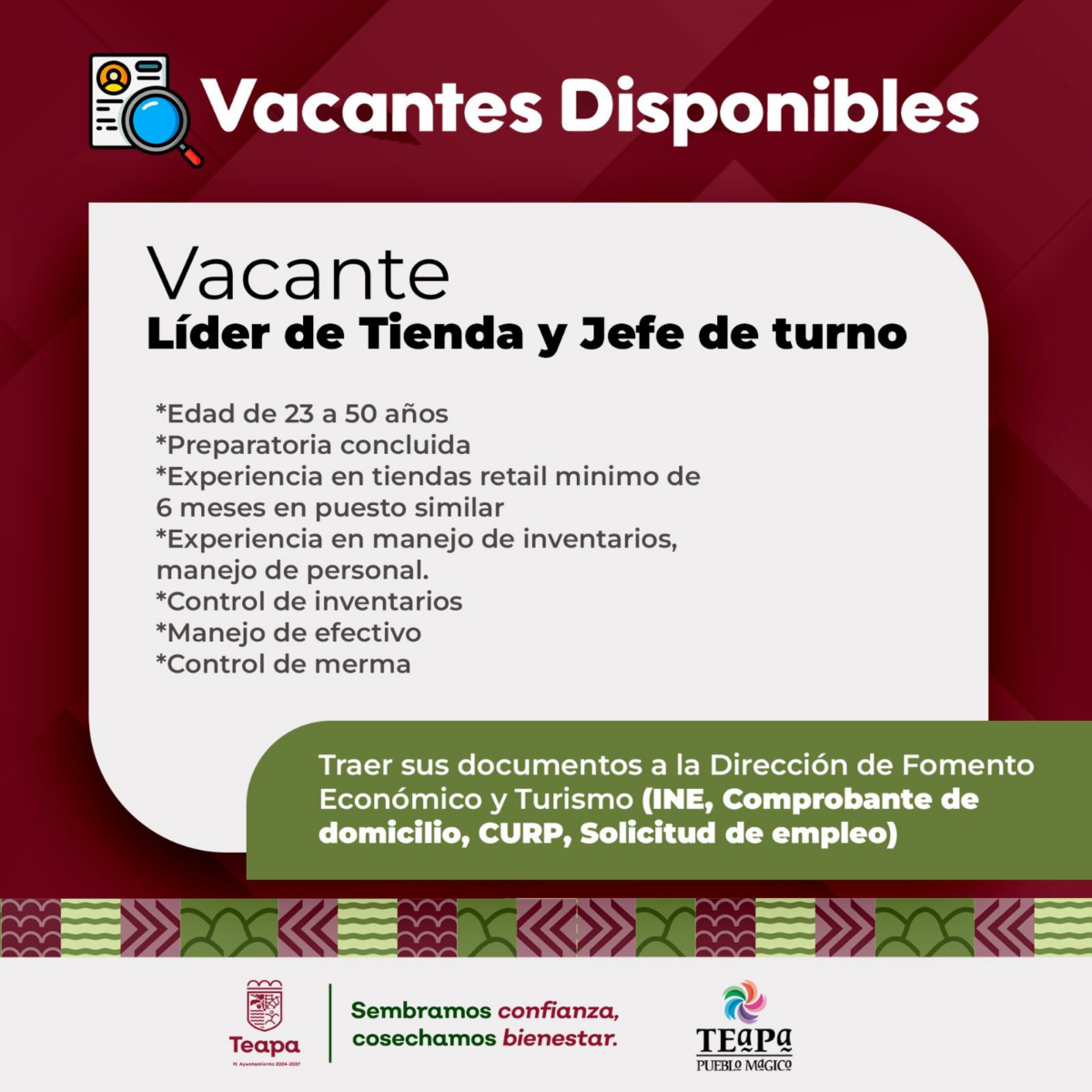 Te compartimos las vacantes disponibles. Acude a las oficinas de Fomento Económico y Turismo, para mayor información, ubicada en la calle 27 de febrero, Centro Administrativo.