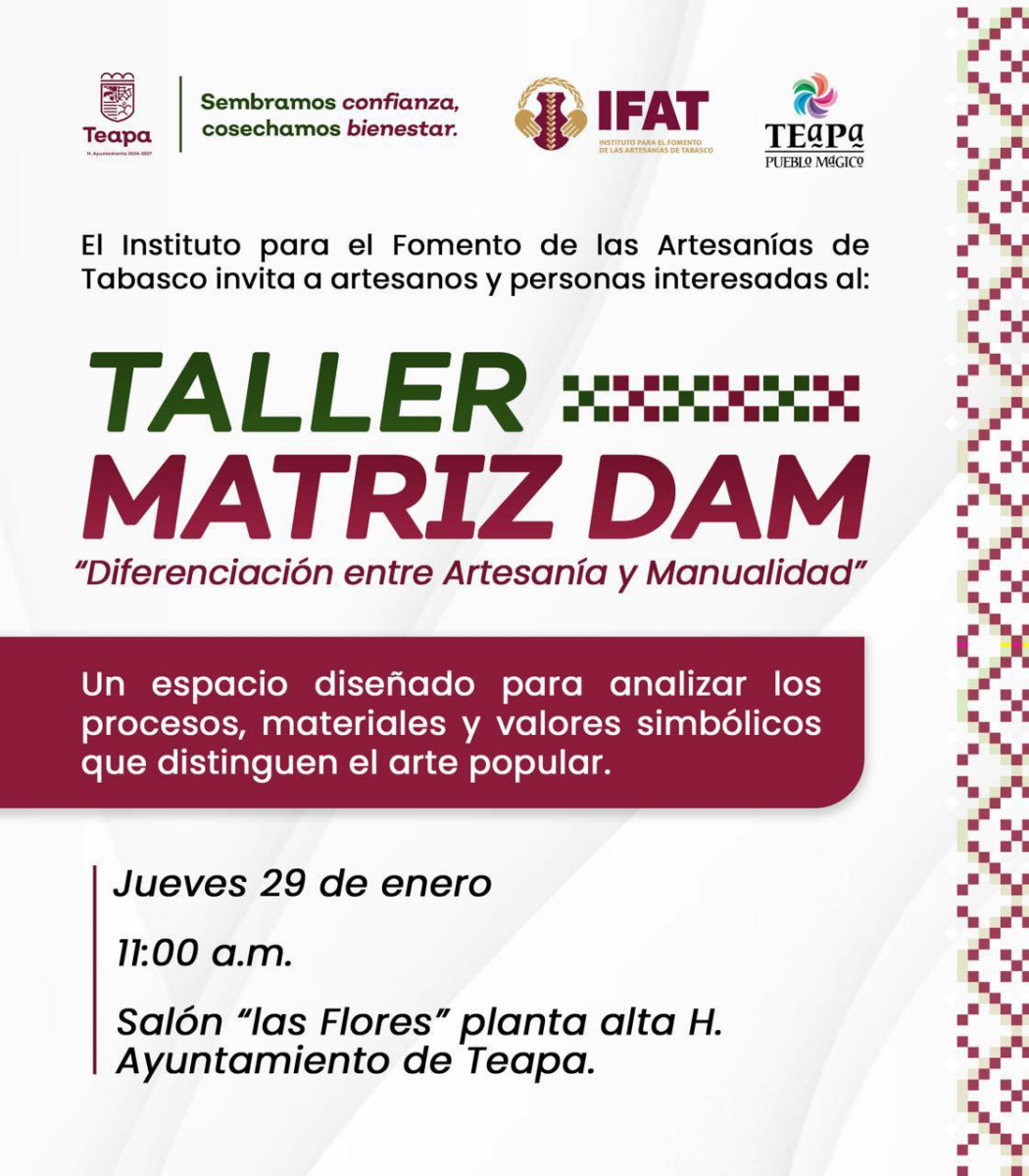La Dirección de Fomento Económico y Turismo en coordinación con el IFAT, te invitan al taller “Matriz DAM, Diferenciación entre Artesanía y Manualidad”.