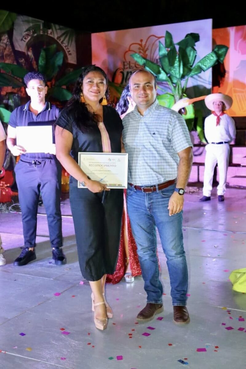 Finalmente, la tan esperada corona de la Flor del Oro Verde Teapa 2026 fue para Evelin Estrella Torres Brito, quien recibió su premio de manos del Edil de Teapa, Miguel Angel Contreras Verdugo, la Síndico de Hacienda, Alexia Domínguez Cano, la Directora de Fomento Económico y Turismo, Karla Casanova Machín, y la Flor del Oro Verde 2025, Kellyn Marely de la Cruz.